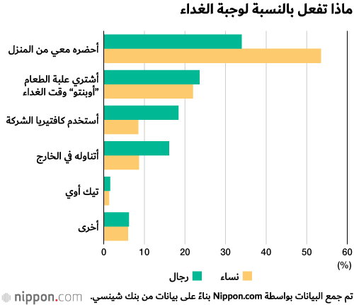 وكان أكثر رد من جانب الرجال والنساء على السواء هو أنهم تناولوا غداءهم الذي أعدوه في المنزل في العمل، حيث أجابت أكثر من نصف النساء اللائي شملهن الاستطلاع بهذه الطريقة. في حين أن 18.4% من الرجال يستخدمون كافتيريا الشركة، مقابل 8.5% فقط من النساء.