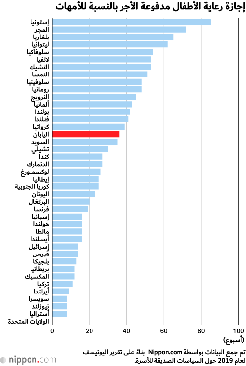 احتلت اليابان المرتبة السادسة عشرة في إجازة الأمومة، حيث تمكنت الأمهات من الحصول على 36 أسبوعًا. احتلت إستونيا المرتبة الأولى برصيد 86 أسبوعًا والمجر في المركز الثاني برصيد 72 أسبوعًا. كما أظهر التقرير أن نصف الدول التي شملها البحث فقط قدمت للأمهات ما لا يقل عن ستة أشهر إجازة مدفوعة الأجر لرعاية الأطفال. أما بالنسبة للرجال فقد احتلت الولايات المتحدة المرتبة الأدنى. كانت الولايات المتحدة هي الدولة الوحيدة التي لم تقدم إجازة لرعاية الطفل سواء للرجال أو النساء.
