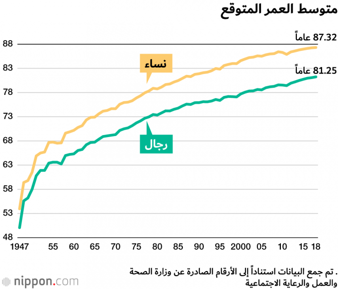 لقد بلغ متوسط العمر المتوقع في اليابان 81.25 سنة بالنسبة للرجال و87.32 سنة فيما يخص الإناث في عام 2018، وهي أعلى الأرقام المسجلة على الإطلاق، ويذكر أن متوسط العمر المتوقع عندما جمعت الإحصاءات لأول مرة في عام 1947 كان 50.06 سنة للرجال و53.96 سنة للنساء، وقد ساهمت منذ ذلك الحين أوجه التقدم الضخمة في علاج الأمراض، إلى جانب الوعي الصحي المتزايد لدى اليابانيين في إطالة عمر السكان. وهذا ما ساهم في ارتفاع متوسط العمر المتوقع باطراد لسبع سنوات للرجال وست سنوات للنساء.