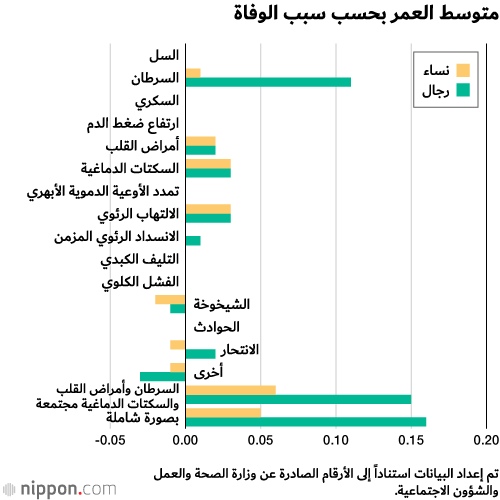 تتوقع وزارة الصحة والعمل والشؤون الاجتماعية أن 28.72% من الرجال و20.01% من النساء المولودين في اليابان عام 2018 سيموتون بالسرطان، ورغم أنه لم يعد مرضاً غير قابل للشفاء إلا أنه يبقى السبب الرئيسي للوفاة على حد سواء بين الجنسين الرجال والنساء. وإذا أمكن القضاء عليه وتخفيض عدد الوفيات الناجمة عن السرطان إلى الصفر، فمن المقدر أن يزيد عمر الرجال بمقدار 3.54 سنة، والنساء 2.84 سنة.