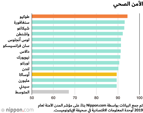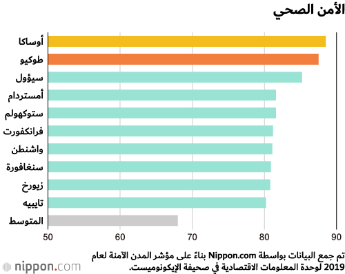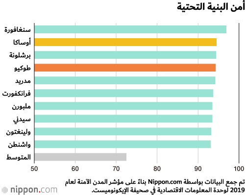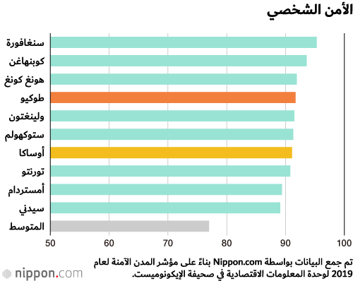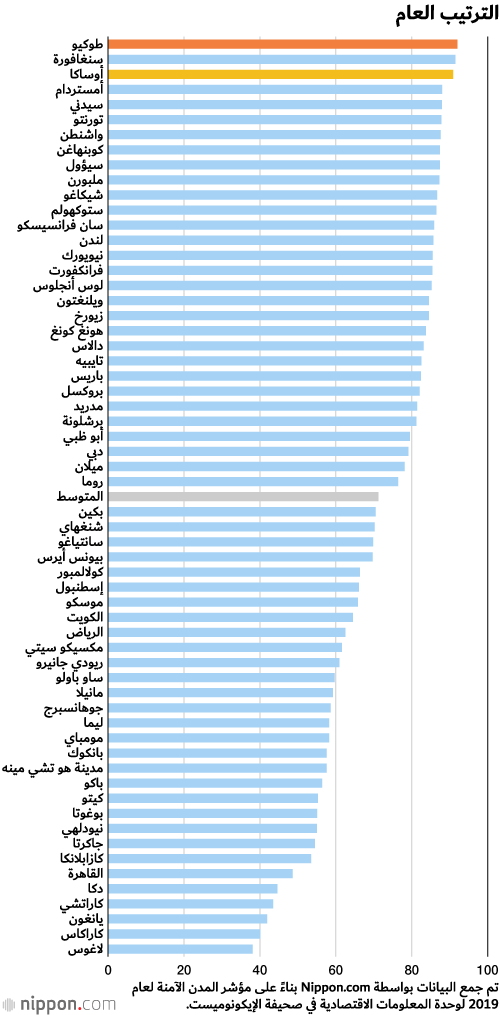 تم جمع البيانات بواسطة Nippon.com بناءً على مؤشر المدن الآمنة لعام 2019 لوحدة المعلومات الاقتصادية في صحيفة الإيكونوميست.