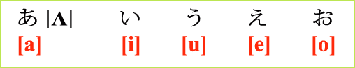 ويتكون النظام الصوتـي اللغوي فـي اللغة اليابانية علـى أساس المقاطع الصوتية، فيتكون كل مقطع صوتـي من هذه المقاطع الصوتية عادة من صائت، أو من حرفين أحدهما صامت، والآخر صائت، وذلك ماعدا الصوت (ん-n) الدال علـى السكون، أي أن الصوامت فـي اللغة اليابانية لا تُستخدم منفصلة (ماعدا الصوت (ん-n)) حيث يجب أن يُلصق بـها أحد الصوائت الخمسة كما فـي الجدول التالـي: