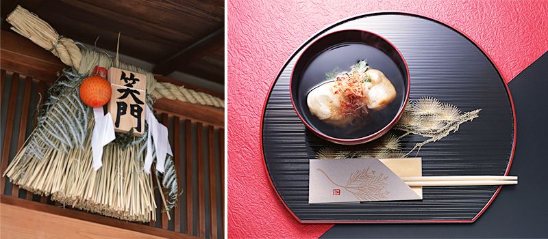 (اليسار) ”شيميكازاري Shimekazari“ موضوعة على مدخل منزل وهي حبل من القش يستخدم كتقليدٍ للتزيين بمناسبة السنة الجديدة.