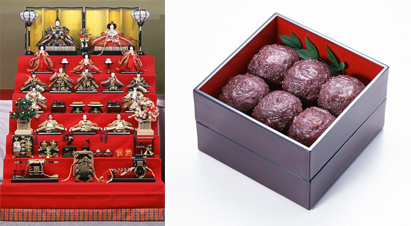 ”هيناماتسوري“ هو عيدٌ يعني مهرجان الدمى وهو وقت لتقديم الشكر على نمو الفتيات الصغار بصحة جيدة. حيث يزين الناس بيوتهم بالدُمى المميزة ”هينا“ - والتي تدل غالباً عن شخصيات البلاط الامبراطوري من أمراء ونحو ذلك- من جانب وتُقدَّم لها قرابين من الخمر الأبيض ورقاقات بسكويت الأرز الملونة ”أراري موتشي Arare Mochi“ وأزهار الدراق. من جانب آخر وهناك طبقان شائعان يترافقان مع هذا الاحتفال وهما ”تشيراشي زوشي Chirashi-zushi“ وهي من أطباق السوشي المكونّة من الأرز الممزوج بالخل والمٌغطاة بعدئذٍ بقطعٍ متباينة من أنواع مختلفة من الأسماك والحضروات وذلك بالإضافة إلى طبق من حساء ”البطلينوس“ يعرف باسم ”هاماغوري Hamaguri“.
