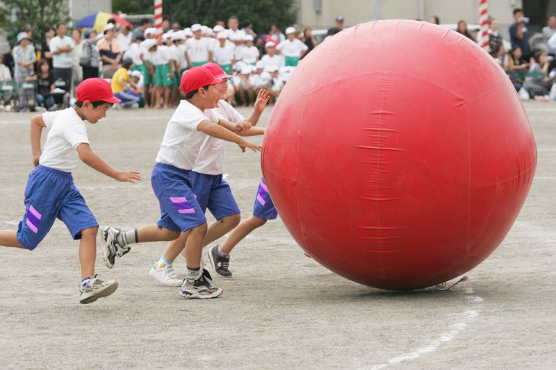 طلاب مدرسة ابتدائية يدورون حول كرة عملاقة في مهرجان الرياضة في مدرستهم أو أوندوكاي.