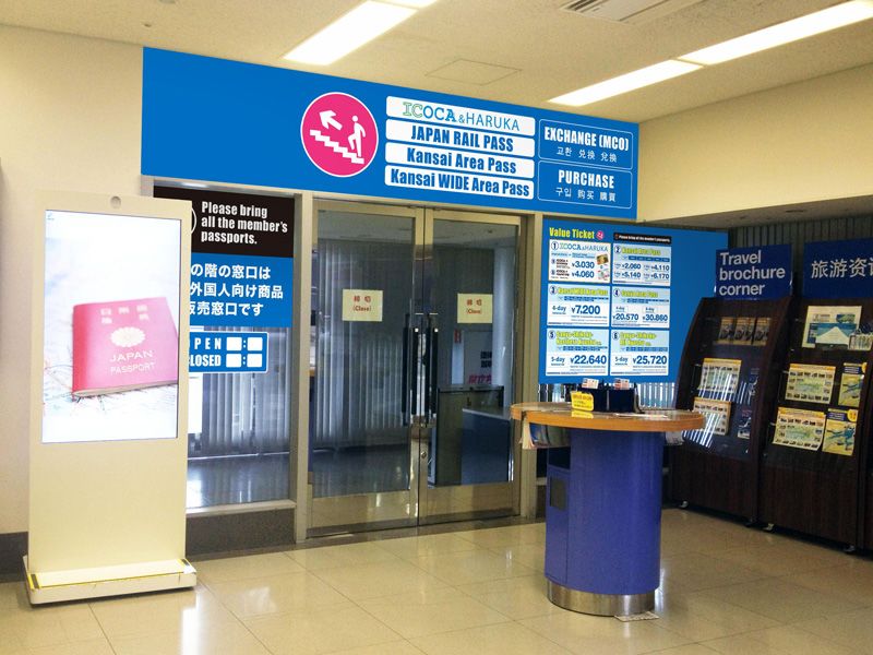 الكابينة المخصصة للسائحين الأجانب في مطار كانساي الدولي. بها موظفون يتحدثون الإنكليزية والصينية، وتقدم تذاكر (تشمل ”مجموعة بطاقة ذكية إيكوكا وتذكرة هاروكا“)، وتلعب دورها كمكتب استلام Japan Rail Pass (الصورة مهداة من شركة خطوط السكك الحديدية اليابانية JR الغربية)
