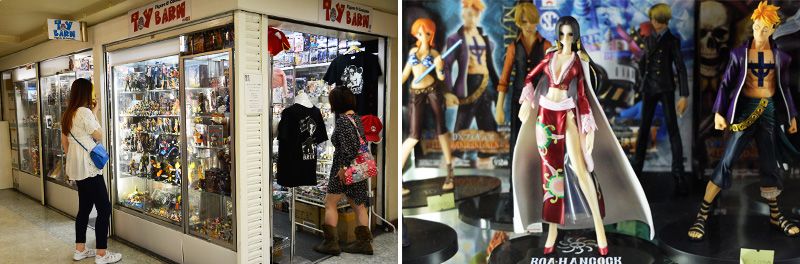 (في اليمين) منتجات المجسمات المختلفة، (في اليسار) فاترينة لعرض منتجات المجسمات. مركز ”ناكانو برودواي“ التجاري