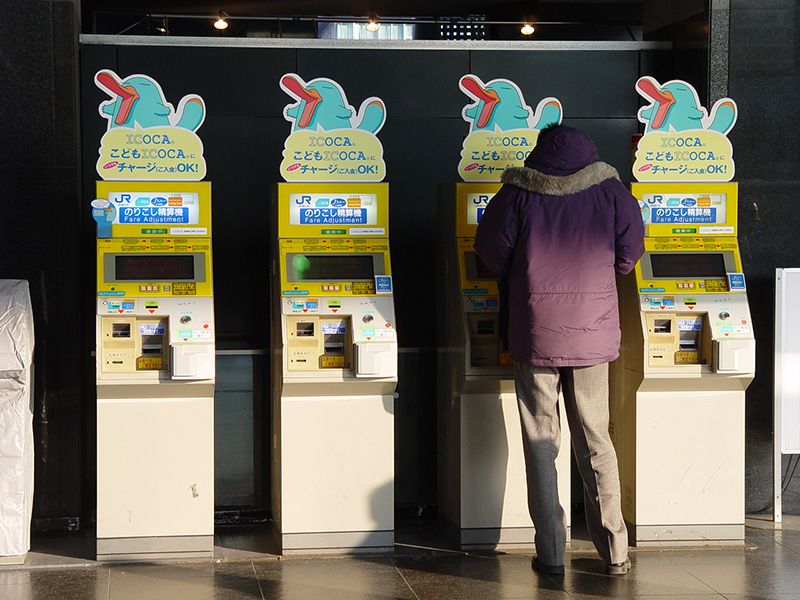 آلات شحن بطاقات ICOCA وهي بطاقات تصدرها شركة غرب اليابان للسكك الحديدية وشعارها ”منقار البط“