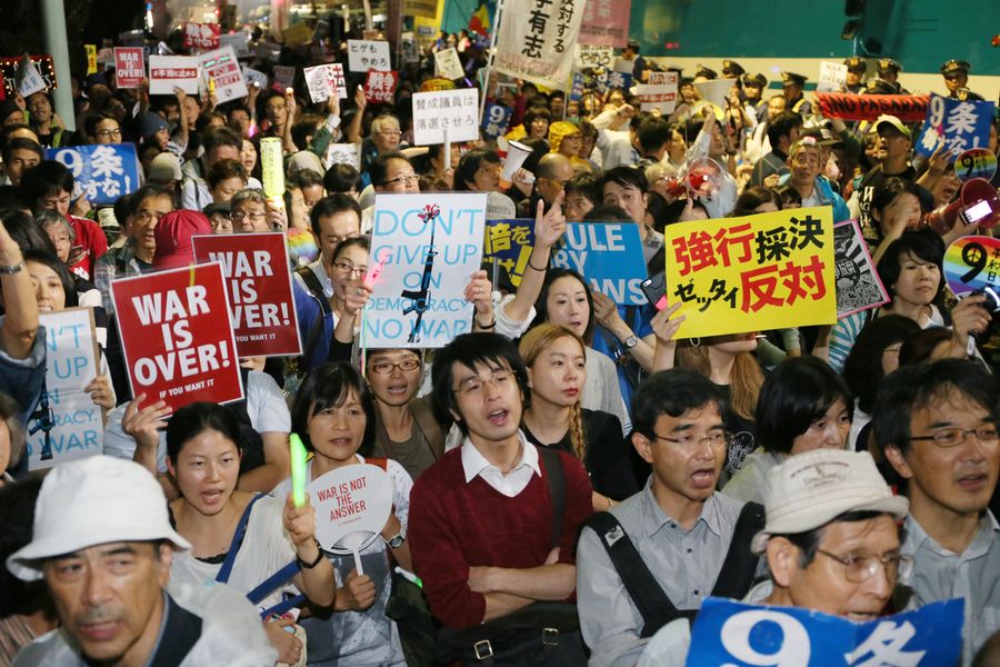 Abe seiji o yurusanai - アベ政治を許さない : لن نغفر لحكومة آبي - هذا ما قاله العديد من المتظاهرين الذين تجمعوا في طوكيو كل أسبوع للاحتجاج ضد تشريعات الأمن وتوسلوا للسياسيين لحماية المادة ٩ من الدستور الياباني الذي ينبذ الحرب.