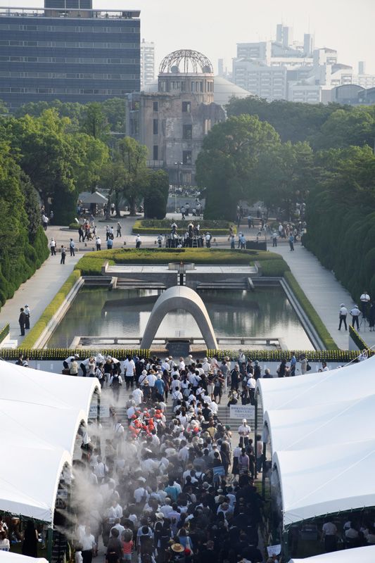 أجريت مراسم السلام التذكارية لمدينة هيروشيما في النصب التذكاري للسلام بمناسبة مرور ٧٠ عاما على إلقاء قنبلة ذرية على المدينة لأول مرة في العالم. وحضر المراسم نحو ٥٥٠٠٠ شخص من الناجين وأقربائهم، بالإضافة إلى رئيس الوزراء شينزو آبي ووكيلة وزارة الخارجية الأمريكية لشؤون الحد من التسلح والأمن الدولي روز غوت مولر وممثلين عن أكثر من ١٠٠ دولة. بينما حضر مراسم السلام التذكارية الخاصة بمدينة ناغاساكي في ٩ أغسطس/آب ممثلون عن ٧٥ دولة.