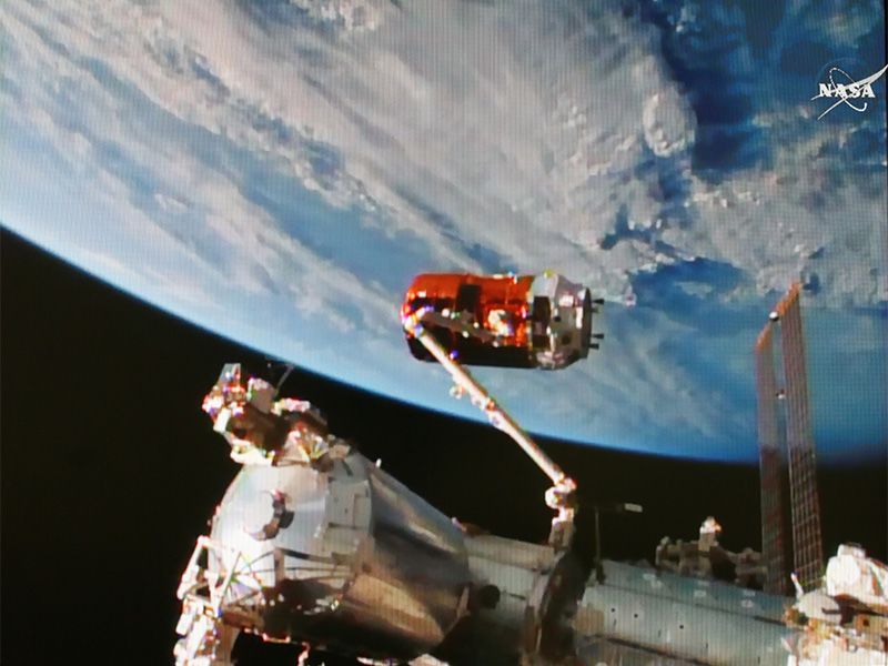 الذراع الآلية لمحطة الفضاء الدولية (أسفل الصورة) تمسك بمركبة الفضاء كونوتوري في ٢٤ أغسطس/آب ٢٠١٥. الصورة مقدمة من تلفزيون ناسا (عن طريق جيجي برس).