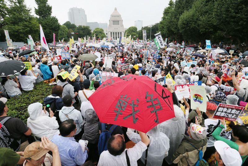 أقيمت مظاهرة كبيرة في ناغاتاتشو بطوكيو احتجاجا على تشريع أمني من شأنه أن يمكّن اليابان من ممارسة حق الدفاع الذاتي الجماعي. وانسدت الشوارع حول مبنى البرلمان بعشرات الآلاف من المتظاهرين وذلك في أكبر مظاهرة حتى الآن ضد التشريع الأمني. كما أقيمت احتجاجات مماثلة في أكثر من ٣٠٠ موقع في أنحاء البلاد.