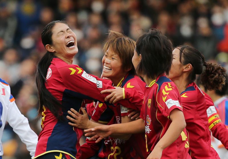 ساوا هوماري (أقصى اليسار) تحتفل مع زميلاتها في فريق INAC كوبيه بعد إحراز هدف الفوز في المباراة النهائية من بطولة كأس الإمبراطور في ٢٧ ديسمبر/كانون الأول ٢٠١٥ في استاد تودوروكي بكاواساكي، وهي آخر مبارة لها قبل الاعتزال. (جيجي برس).