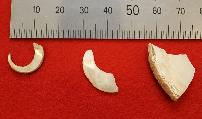 اليسار: خطاف كامل، الوسط: أداة نصف جاهزة، اليمين: قطعة من صدفة لم تعالج بعد في متحف محافظة أوكيناوا ومتحف الفن في ناها، أوكيناوا. (جيجي برس)