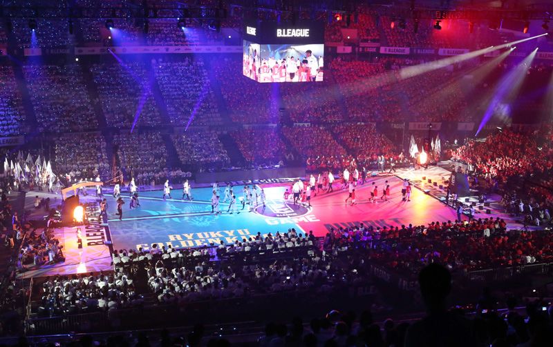 اللاعبون من فريق Alvark Tokyo وفريق Ryūkyū Golden Kings يدخلون الملعب المزود بإضاءة LED لحضور حفل عقد قبل المباراة الإفتتاحية لدوري B. في الملعب الوطني يويوغي في طوكيو يوم ٢٢ سبتمبر/أيلول، ٢٠١٦. (جيجي برس)