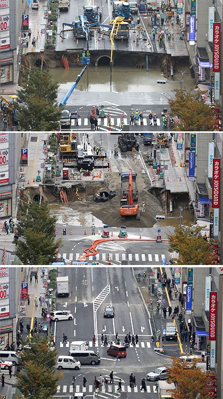انهيار أرضي هائل في مقطع من الطريق وسط مدينة فوكوؤكا بالقرب من محطة هاكاتا حيث العمل على بناء مترو الأنفاق مستمر. تم إجلاء سكان المنطقة القريبة، والبلدية تملأ الحفرة بالتراب االمخلوط بالإسمنت. وقد تمت استعادة خدمات المرافق بالكامل يوم ١٣ نوفمبر/تشرين الثاني، وأعيد فتح الطريق أمام حركة المرور في ١٥ نوفمبر/تشرين الثاني.