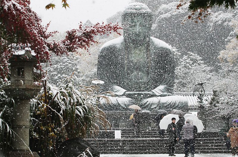 تساقط الثلوج على تمثال بوذا العظيم في معبد كوتوكوإن في كاماكورا، محافظة كاناغاوا، في ٢٤ نوفمبر/تشرين الثاني ٢٠١٦. (جيجي برس)