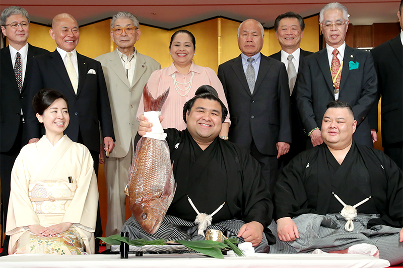 تاكاياسو (وسط الصف الأول) يمسك بيده سمكة مرجان ”تاي“ أثناء احتفال بهذه المناسبة وذلك بعد حفل رسمي للإعلان عن ترقيته أقيم في طوكيو في ٣۱ مايو/ أيار ۲۰۱٧. وعلى يمينه يجلس تاكانوتسورو وهو رئيس نادي تاغونوؤرا الذي يتبع له تاكاياسو. كما يظهر في الصف الثاني من الصورة والده إييجي (الثالث من اليمين) ووالدته الفلبينية بيبيليتا (وسط الصورة). جيجي بريس.