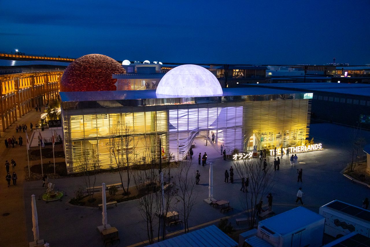 يحتفي جناح هولندا في أوساكا إكسبو 2025 بشعار ”بناء فجر جديد معًا على أرضية مشتركة“، مجسدًا رؤية تعاونية لخلق قيم جديدة من خلال تبادل الأفكار على أسس مشتركة. يتميز الجناح بتصميم خارجي مبهر، حيث تطفو كرة بيضاء بقطر 11 مترًا في وسط المبنى، ترمز إلى الطاقة المتجددة وشروق شمس جديدة. تحتوي هذه الكرة على شاشة عرض بزاوية 360 درجة، تقدم تجربة بصرية غامرة تأسر الزوار.