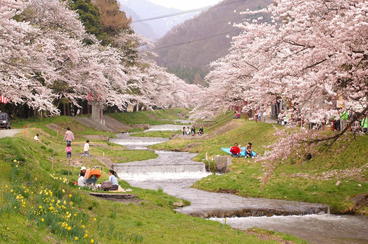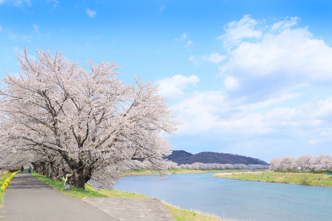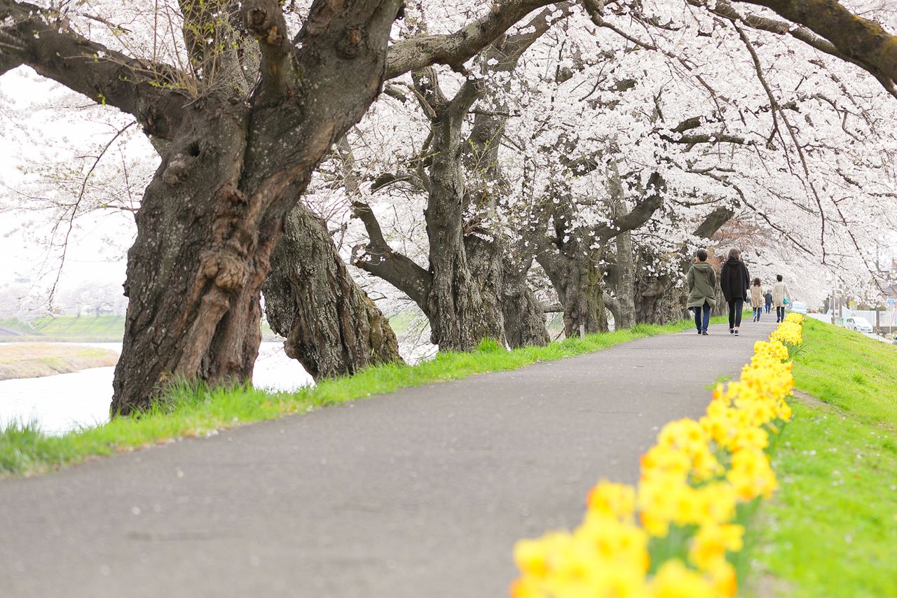 مياه نهر كانونجي الحية تتدفق بين صفوف من أشجار الساكورا. (صورة بموجب تعاون قسم السياحة والتجارة والصناعة في بلدة إيناواشيرو)