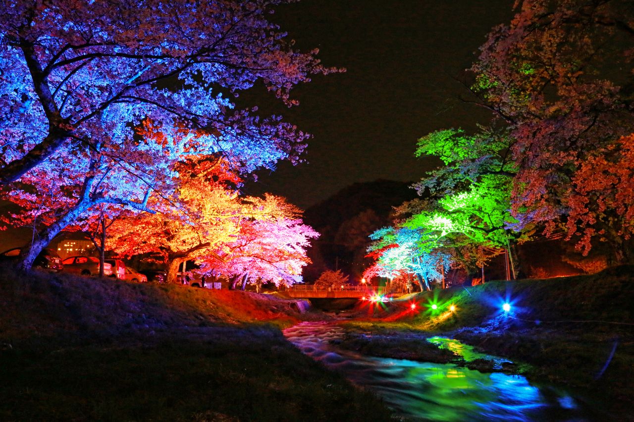 زهور الساكورا في الليل. (صورة بموجب تعاون قسم السياحة والتجارة والصناعة في بلدة إيناواشيرو)