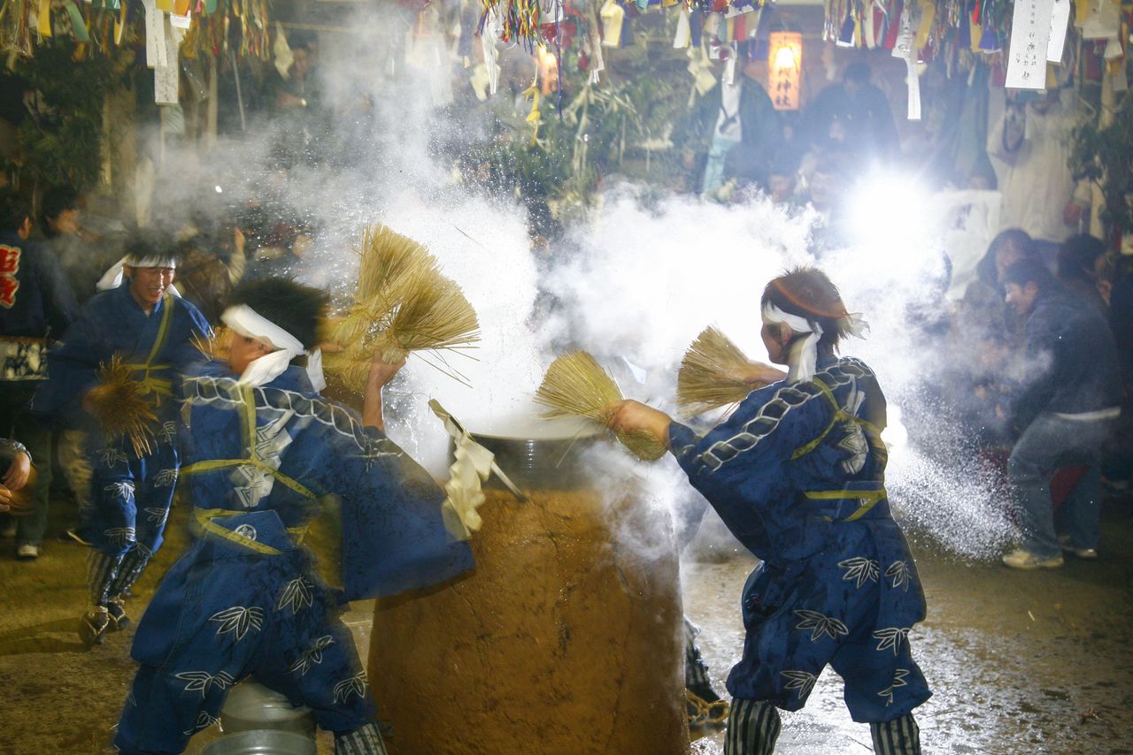 يعتقد اليابانيون أن كل الكامي في الأرض يتجمعون في البخار المتصاعد من القدر. تمنح قوة الماء حيوية متجددة لأولئك الذين يُرشون به (© مكتبة هاغا).