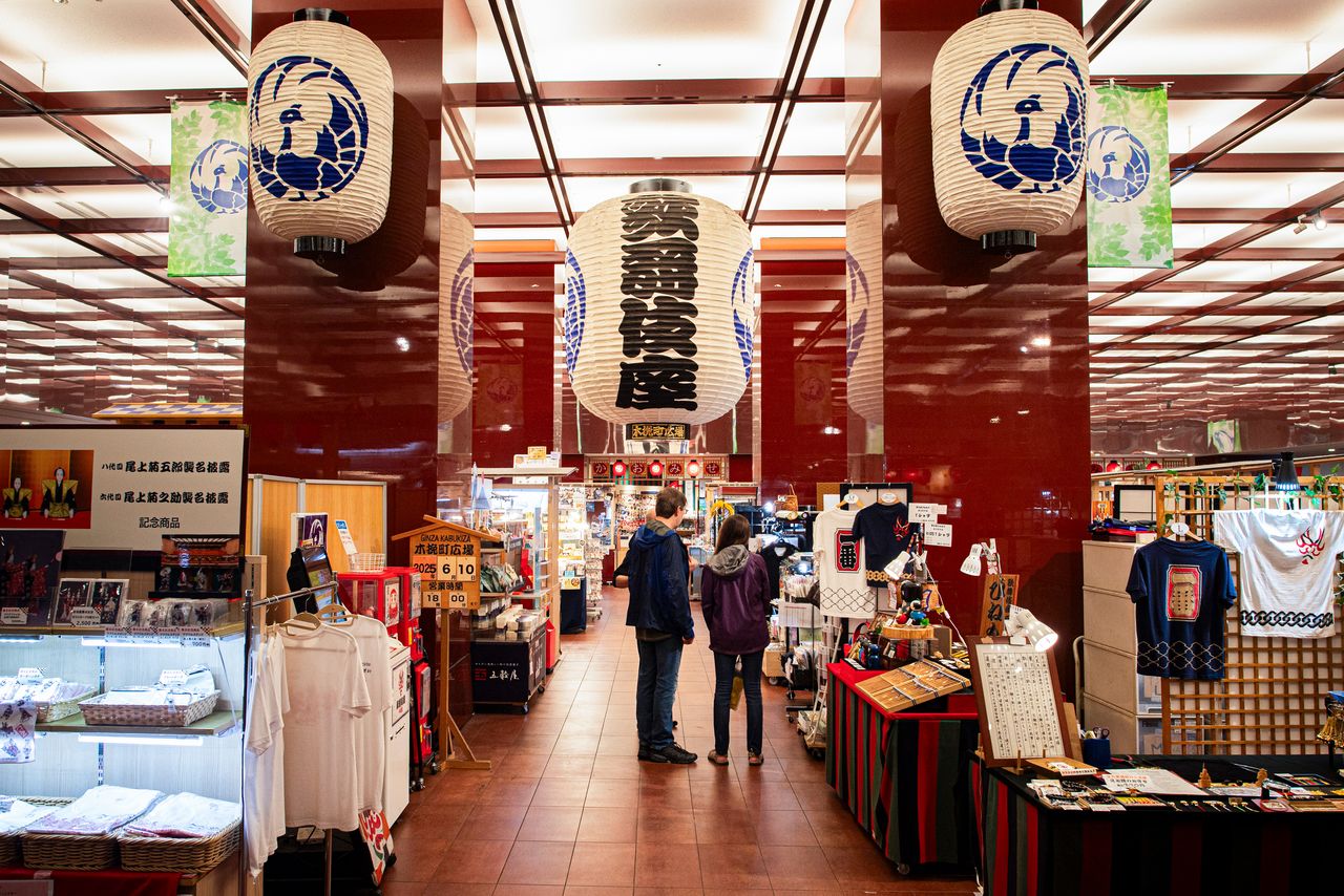 تتوفر وجبات خفيفة وهدايا تذكارية مستوحاة من مسرح الكابوكي بكثرة في السوق الواقعة تحت المسرح. (© ماتسودا تاداو)