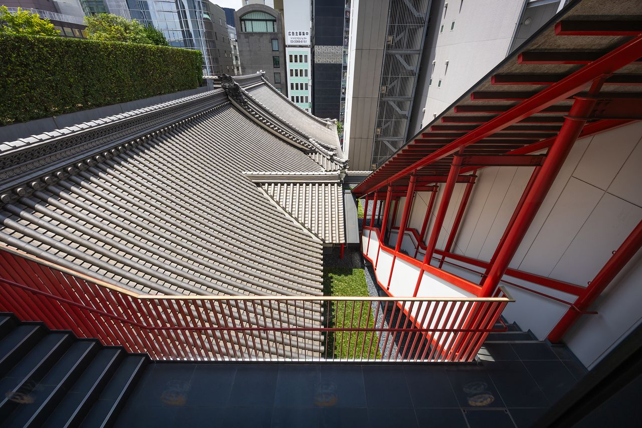 يربط درج غويمون بين ممر الطابق الرابع والمساحة الواقعة على السطح. ومنه يمكن الاستمتاع بإطلالة رائعة على السقف القرميدي للمسرح، بما يبعث في الذاكرة مقولة ”يا له من مشهد رائع!“ من شخصية إيشيكاوا غويمون، اللص الشهير في عالم الكابوكي. (© Nippon.com)