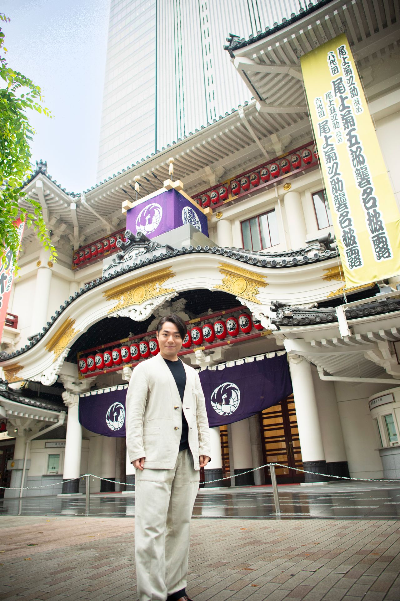 تاكانوسوكي واقف عند مدخل كابوكيزا، معبرا عن أمله في أن يدرج زوار طوكيو المسرح ضمن برامج رحلاتهم. (© ماتسودا تاداو)