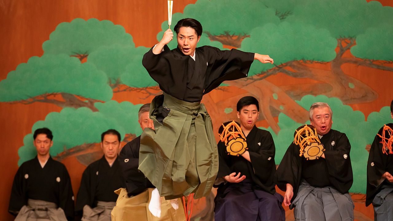 تاكانوسوكي أثناء تأدية دوره في مسرحية فونابينكيي في فبراير/شباط عام 2023 على خشبة كابوكيزا، وقد كان عرضا خاصا بمناسبة مرور 13 عاما على رحيل والده. (© ماتسودا تاداو، بإذن من شوتشيكو)