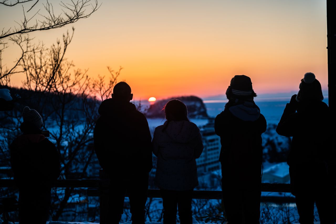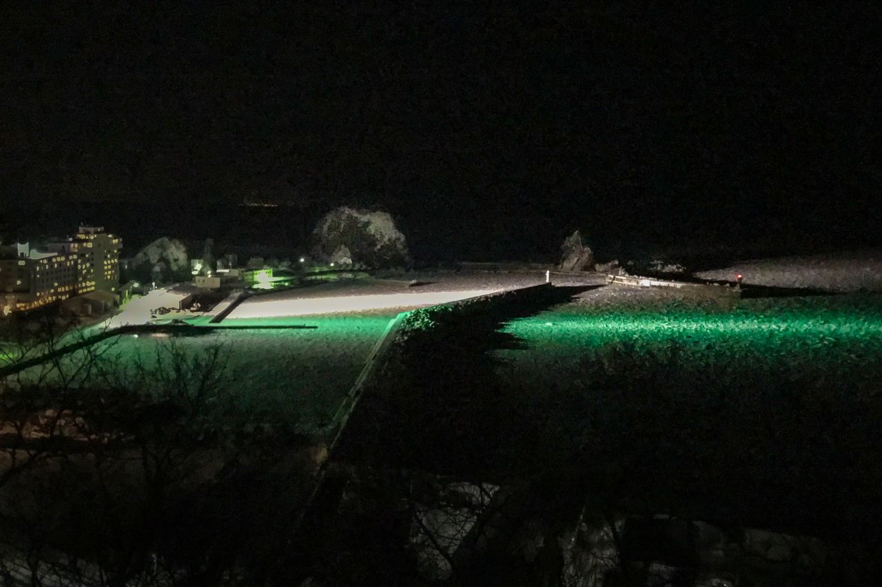 الجليد الطافي مضاءًا كما يبدو من منصة يوهيداي. (الصورة مقدمة من جمعية سياحة شيريتوكو شاري-تشو).