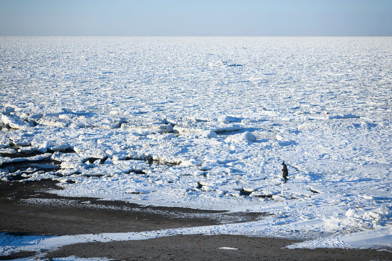 المنظر من رأس بويوني، حيث المياه المغطاة قبالة منطقة أوتورو مغطاة بالجليد الطافي.
