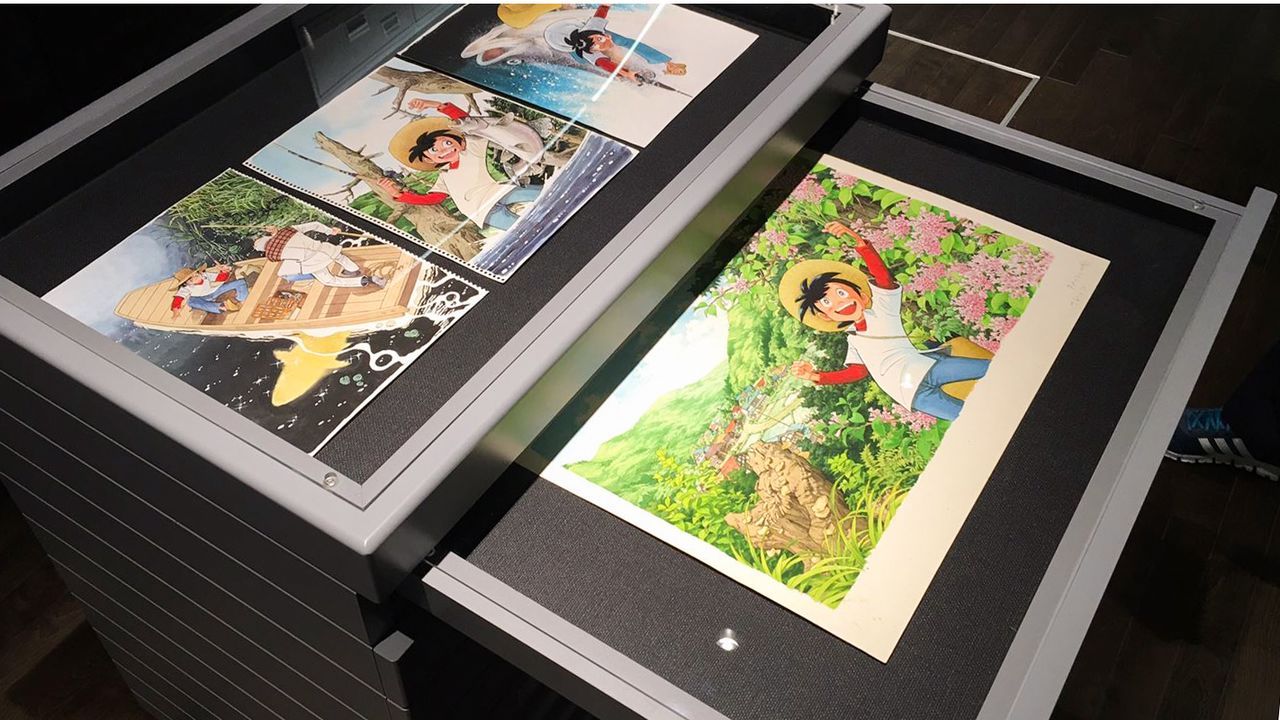 تضم مجموعة الأدراج ذات الواجهة الزجاجية بداخلها أعمالا فنية، وهي تحافظ على درجة حرارة ورطوبة ثابتتين للمساعدة في الحيلولة دون تدهور حالتها. (الصورة بإذن من متحف يوكوتي ماسودا للمانغا)