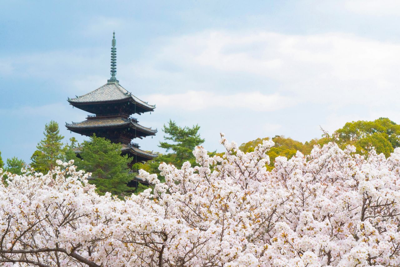 تزهر أشجار أومورو زاكورا في معبد نينّاجي في وقت متأخر لتختتم موسم تفتح أزهار الكرز. يظهر في الخلفية ضمن المعبد برج ’’باغودا‘‘ مكون من 5 طوابق وهو محدد ضمن الأصول الثقافية المهمة، وهو ما يعطي منظرا رائعا.