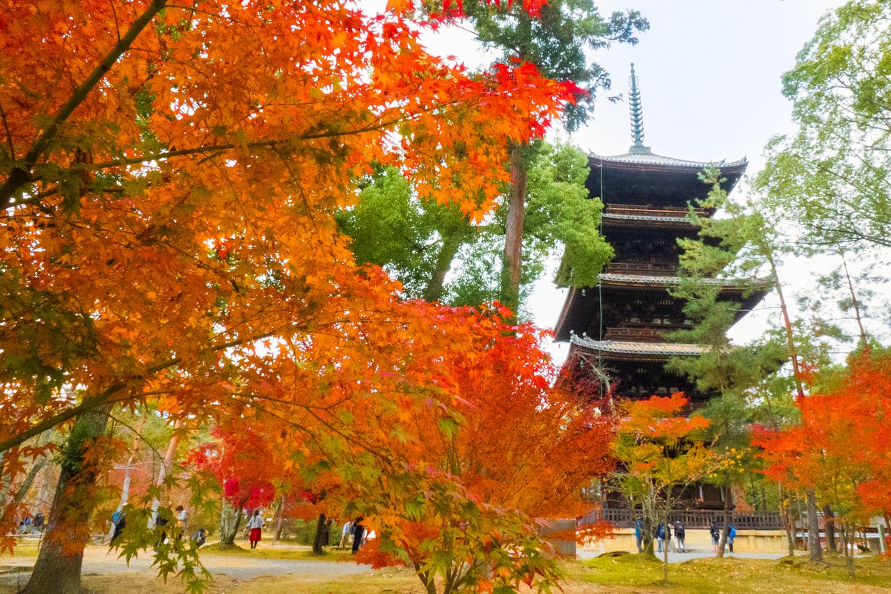 في فصل الخريف، تضيف أوراق أشجار القيقب النابضة بالحياة جوا رائعا لمعبد نينّاجي.