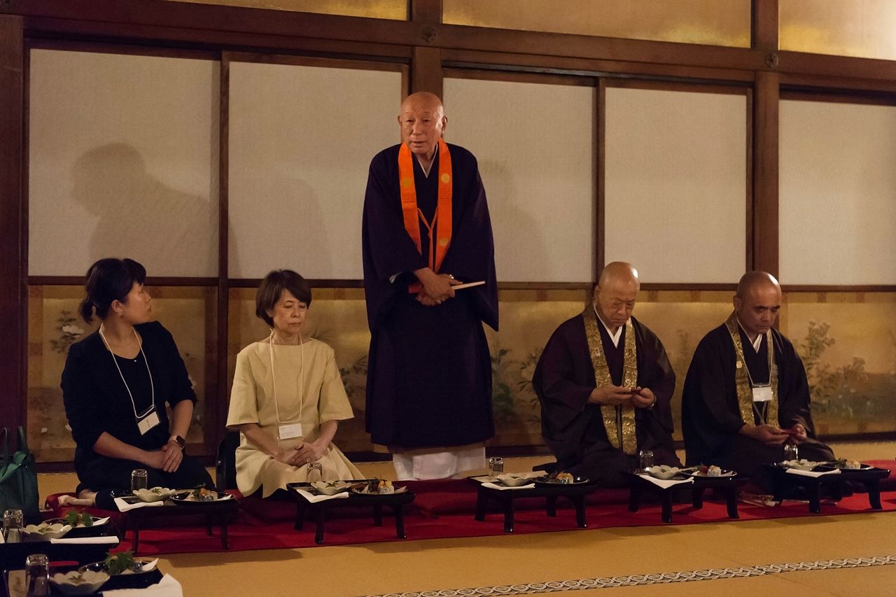 كبير الكهنة سيغاوا تايشو يخاطب الضيوف قبل العشاء في قاعة شيندين.