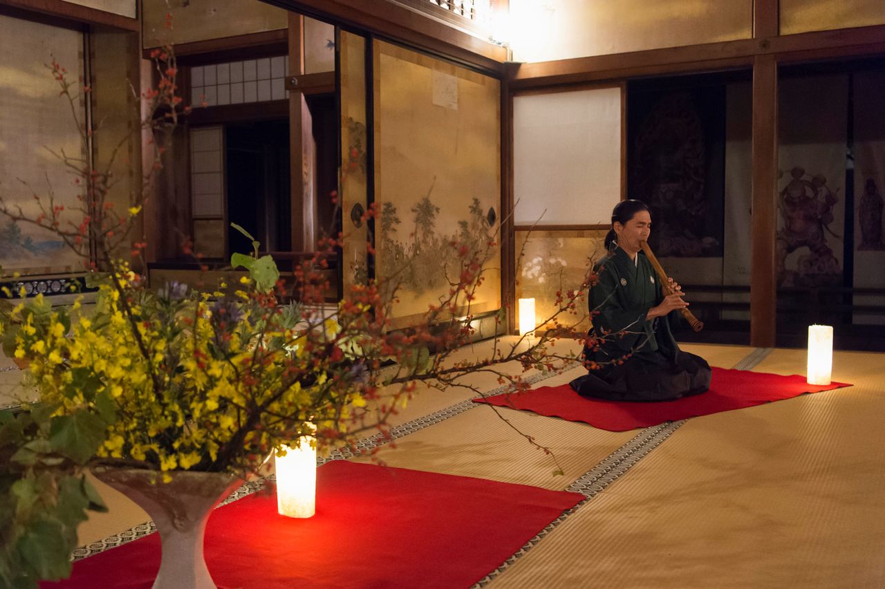 فن إيكيبانا لتنسيق الزهور على طريقة مدرسة أومورو يضيف لمسة ملونة على قاعة شيندين حيث يمكن للضيوف تناول الطعام على أصوات موسيقى غاغاكو الخاصة بالبلاط الإمبراطوري وعزف بفلوت شاكوهاتشي المصنوع من القصب.