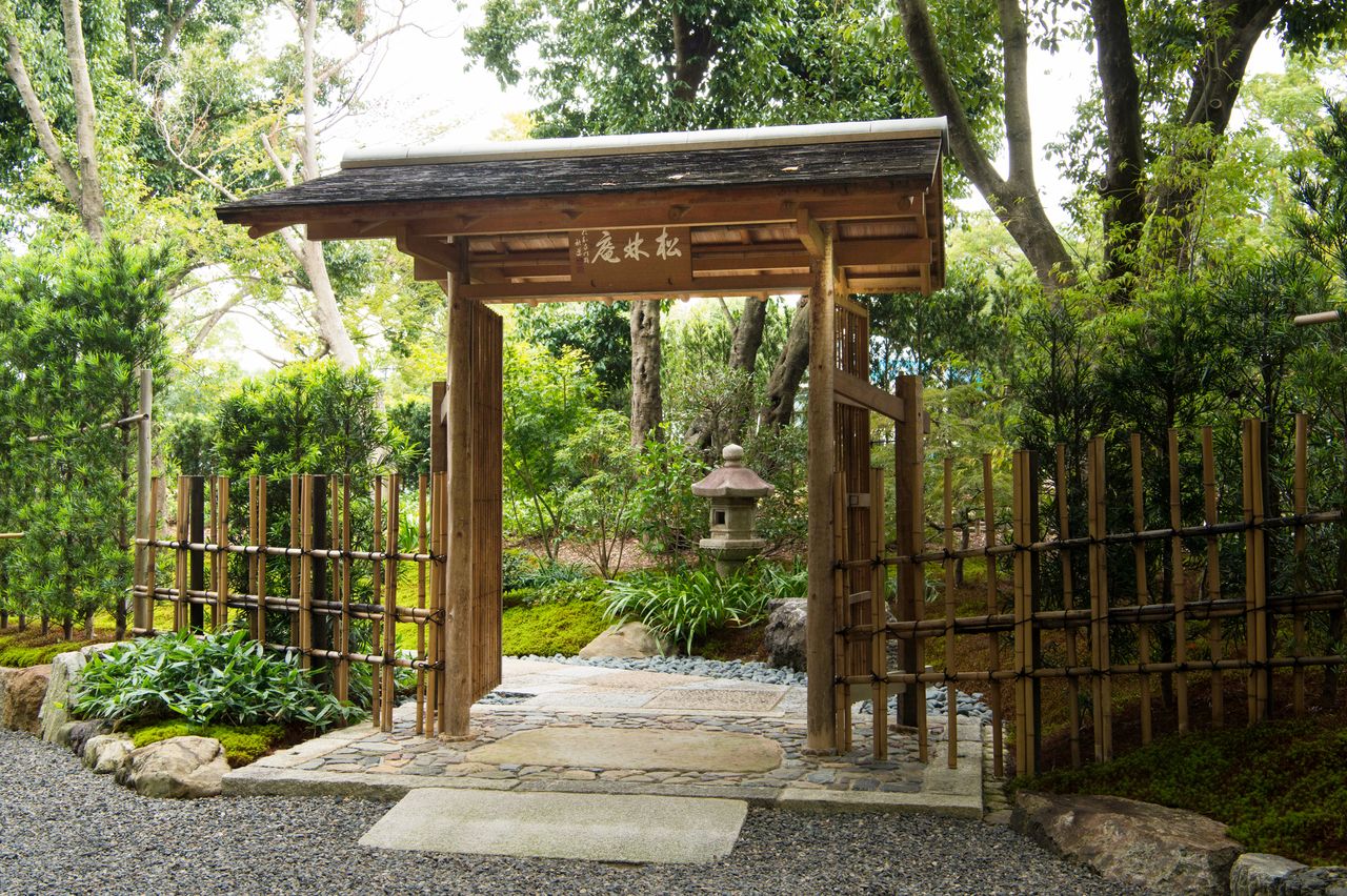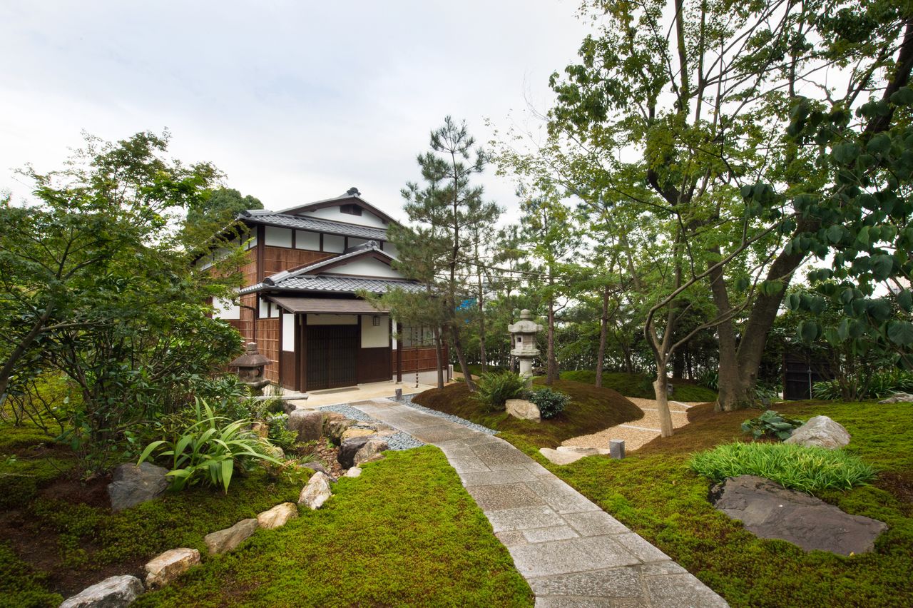 يقع الهيكل المكون من طابقين في حديقة يابانية تثير جوا من الطمأنينة.