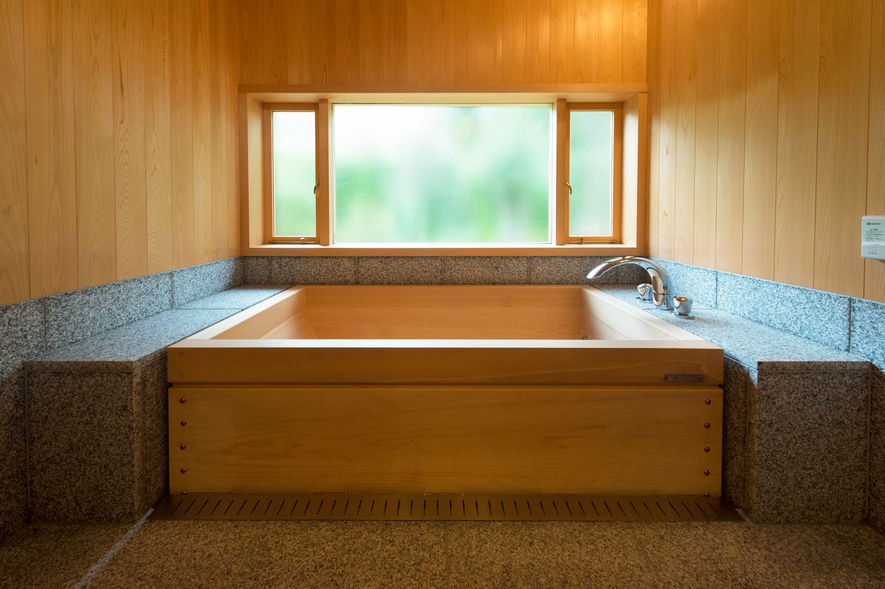 حمام ياباني تقليدي يعتمد في تشييده على الخشب.