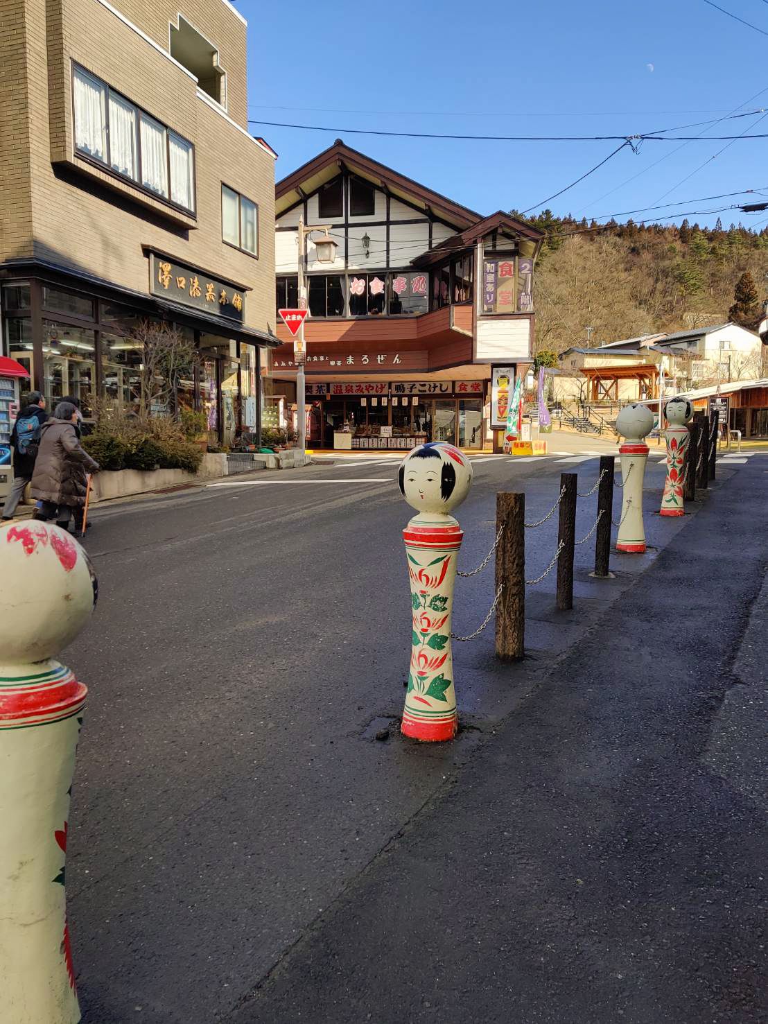 دمى عملاقة مصفوفة على طرف أحد شوارع ناروكو أونسين، أحد مراكز إنتاج كوكيشي.