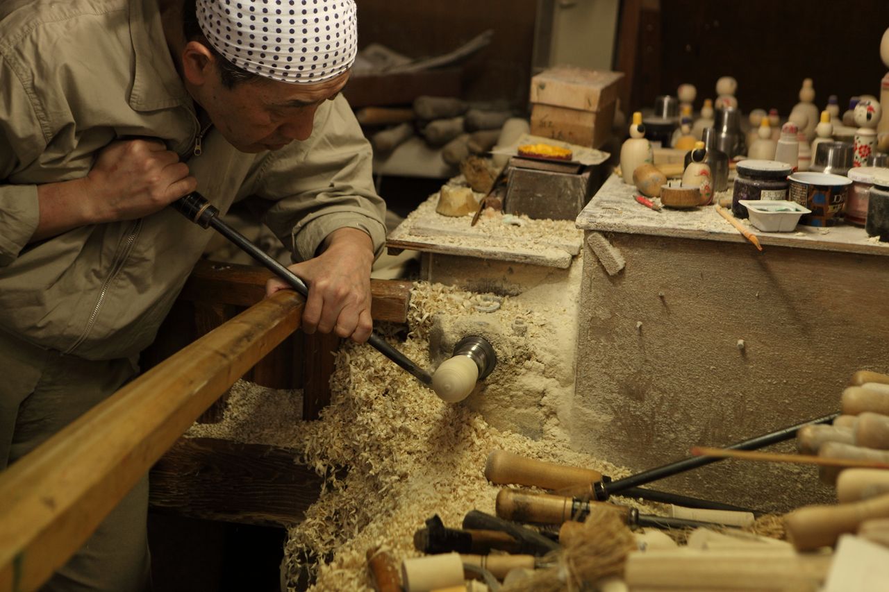 حفر قطعة خشب لصناعة كوكيشي في متجر ساكوراي كوكيشي. يستطيع للزوار هنا تجربة رسم تصميم على دمية كوكيشي الخاصة بهم.