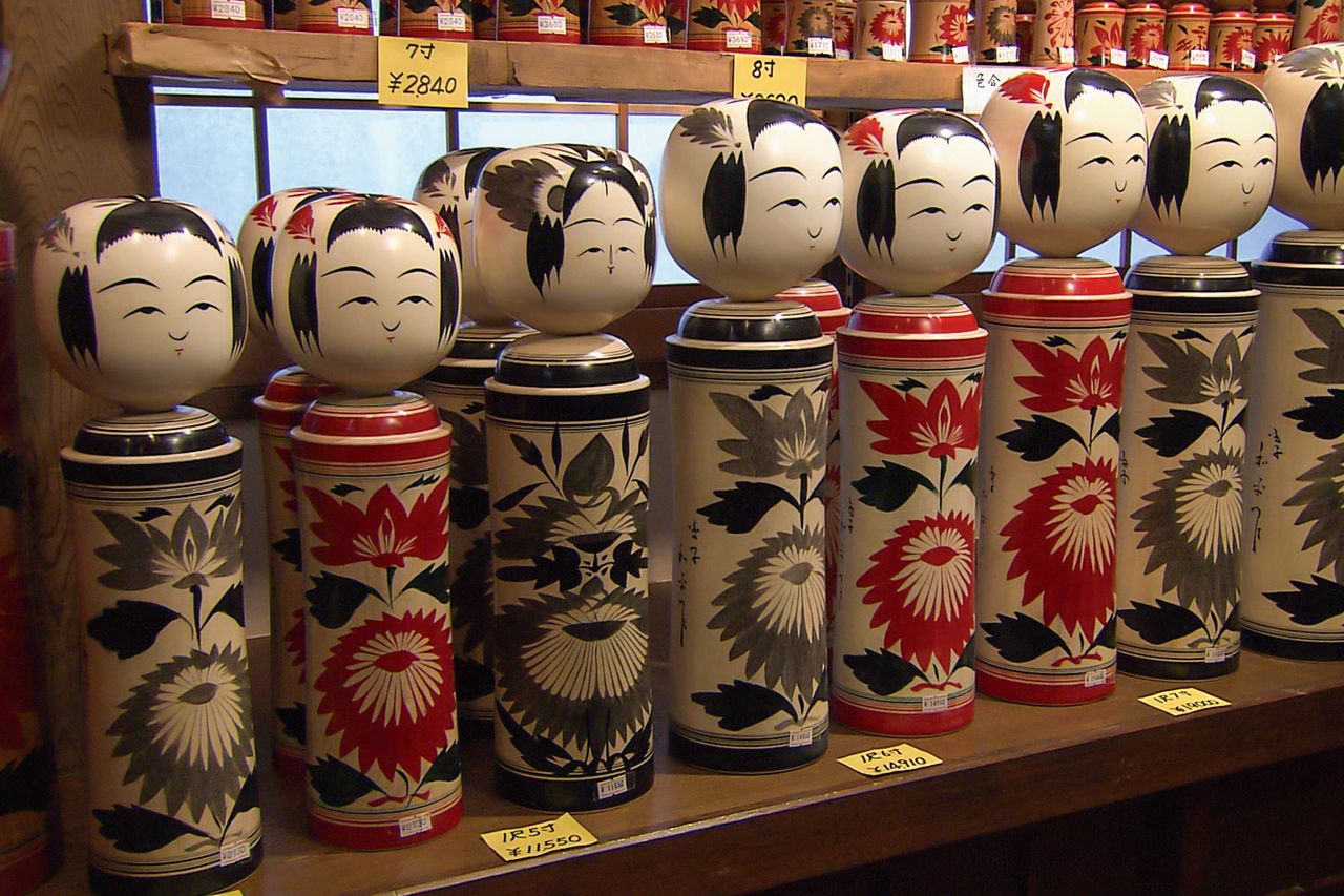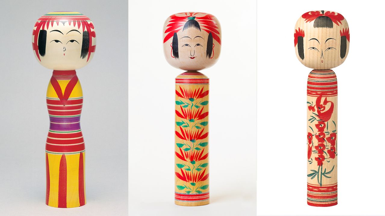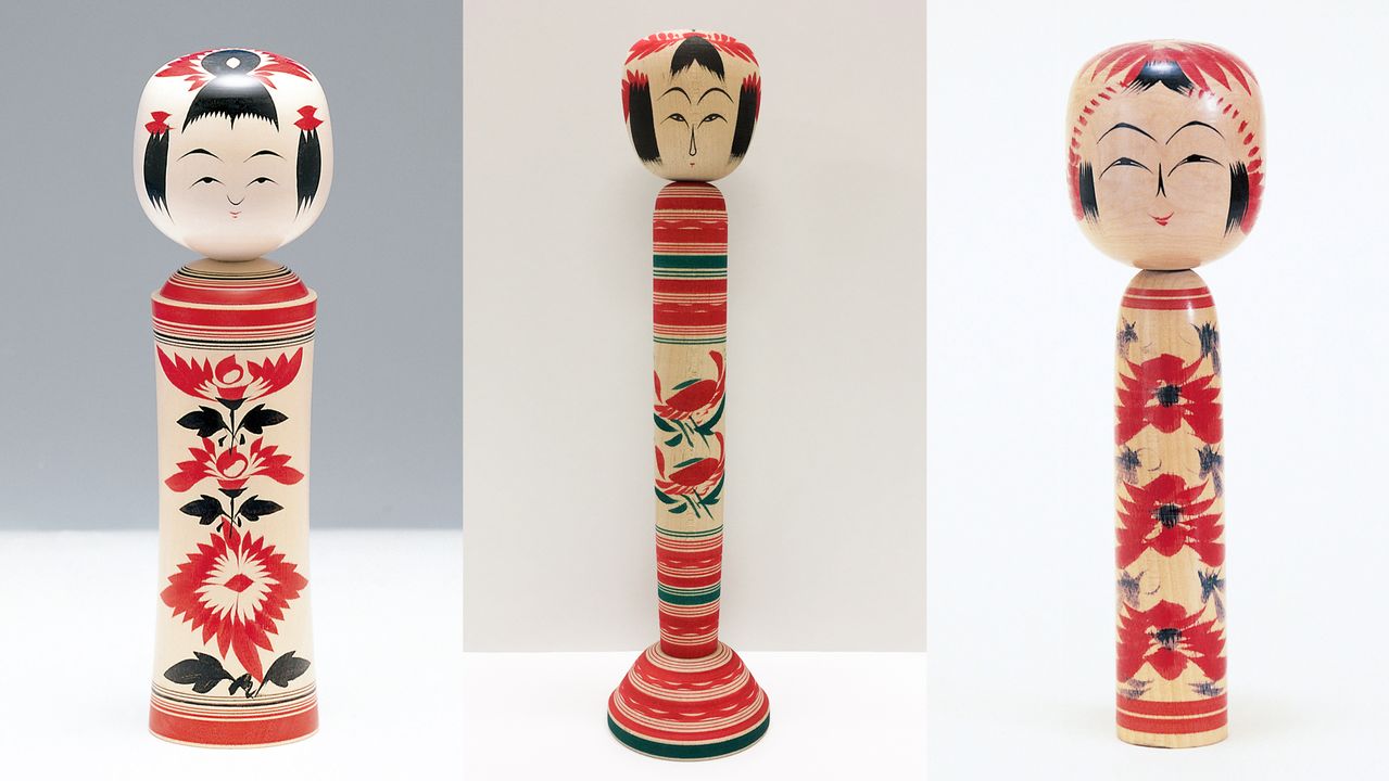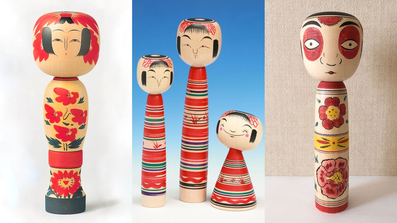 من اليسار: دمى كوكيشي من أنماط زاو، تسوتشييو، ناكانوساوا. (من اليسار، الصور بإذن من إدارة التجارة والسياحة بمدينة ياماغاتا، وجمعية السياحة في تسوتشييو أونسين، وشوبرس).