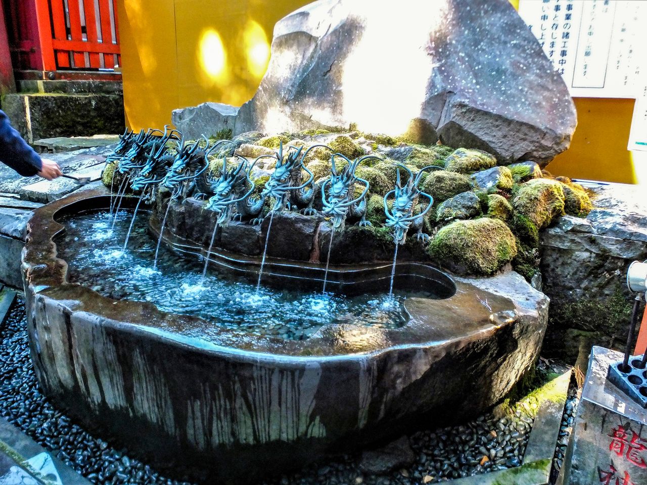 حوض تيميزويا في معبد كوزوريو. ويعتقد أن الماء المتدفق من أفواه التنانين يغسل كل الدنس (© شيبويا نوبوهيرو).