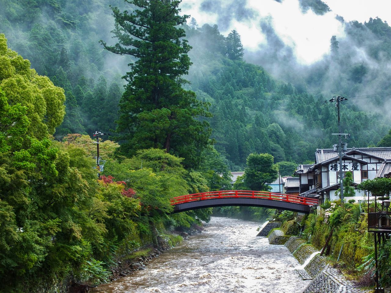 جسر مقوس رائع الجمال فوق نهر مورو، بالقرب من معبد ريوكيتسو (© شيبويا نوبوهيرو).