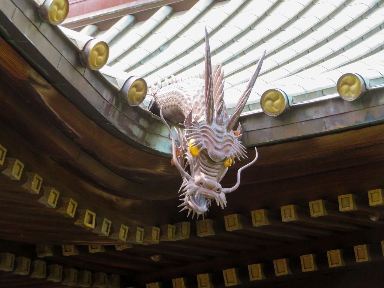 تنين يحدق إلى الأسفل من سقف قاعة الصلاة (© شيبويا نوبوهيرو).