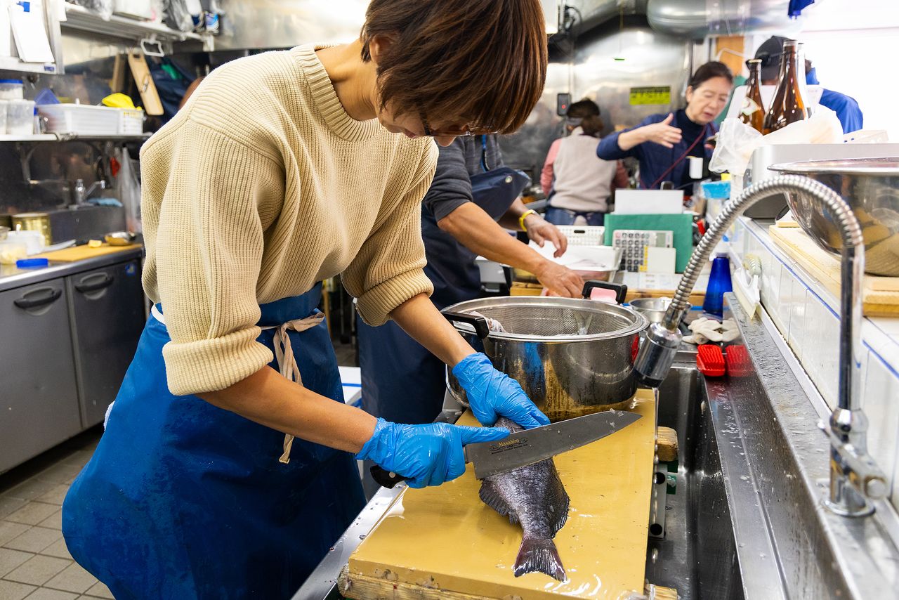يقوم موظفون بمحل السمك ماروكاما سكانايا بحي كيتاكاماكورا بتنظيف السمك وتجهيزه للاستهلاك مباشرة. (© Nippon.com)