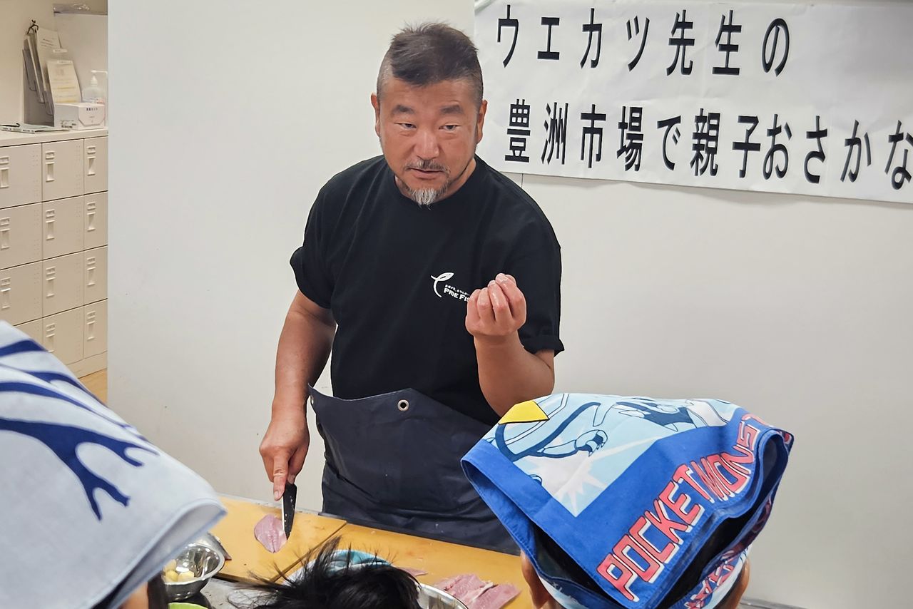 في أغسطس/ آب 2024، نظم أويدا كاتسوهيكو ورشة عمل مميزة لتعليم طهي الأسماك داخل سوق تويوسو، حضرها حوالي ثلاثين شخصًا من بينهم أطفال برفقة أهاليهم. اختار أويدا سمكة الماكريل الياباني كنموذج مثالي لتعليم الحضور كيفية إعداد وجبة شهية بأسلوب بسيط. بدأ العرض بتنظيف السمكة ببراعة، ثم قطع جزءًا منها لتحضير الساشيمي الطازج، بينما استخدم الأحشاء لإعداد يخنة لذيذة ومغذية.