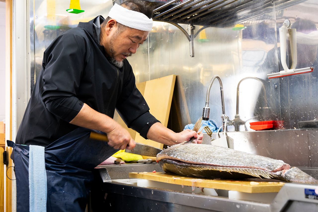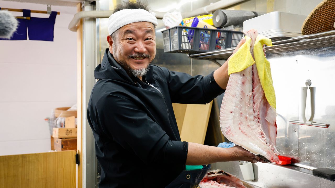 (النص الأصلي باللغة اليابانية، الترجمة من الإنكليزية. الصورة الرئيسية لأويدا كاتسوهيكو بائع السمك على الطريقة التقليدية، وهو يستعرض مهاراته في تنظيف وتحضير الأسماك.© Nippon.com)