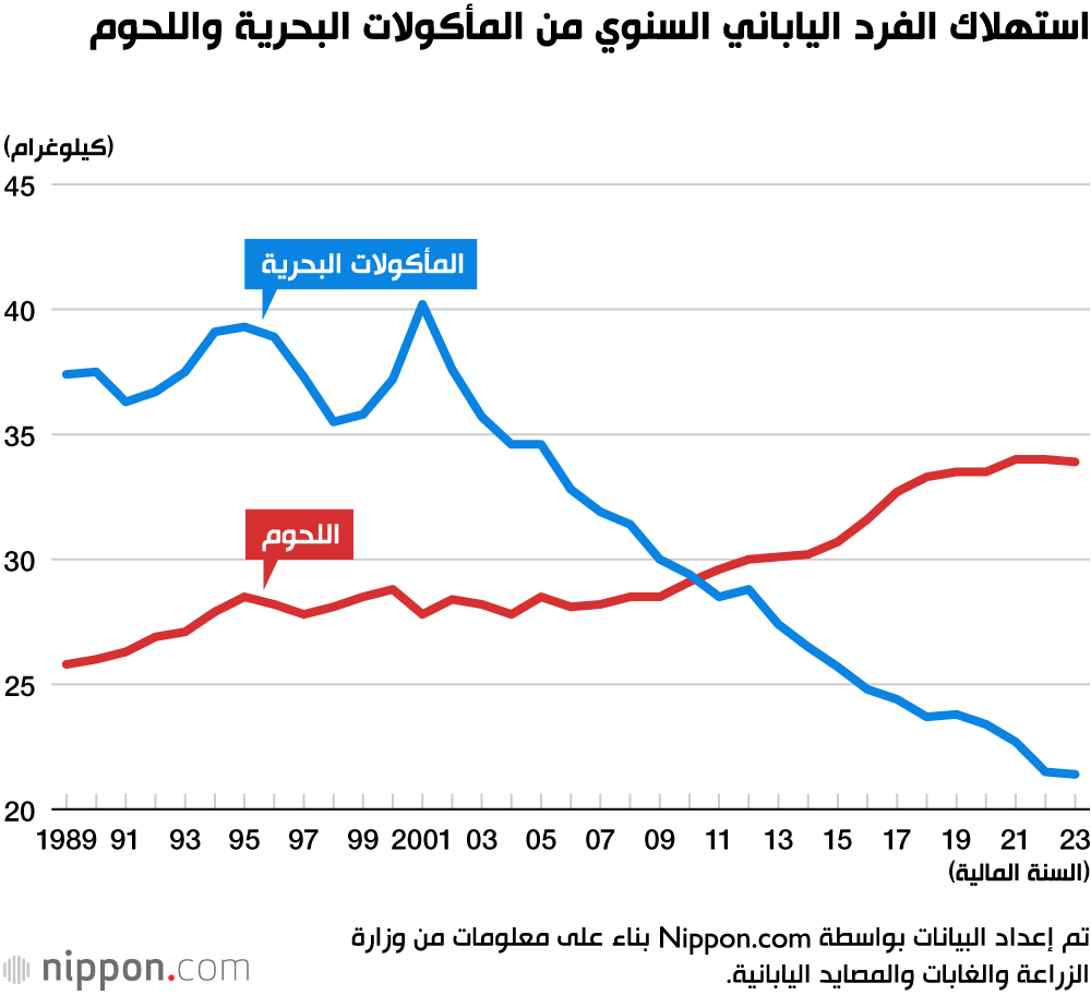 في المقابل، استمر استهلاك اللحوم في الارتفاع بثبات، وسجل لأول مرة تفوقًا على استهلاك الأسماك في عام 2011. ومنذ ذلك الحين، اتسعت الفجوة بينهما بشكل ملحوظ، مما يعكس تحولًا جذريًا في العادات الغذائية لليابانيين. وعلى الرغم من أن اليابان كانت تُعرف تقليديًا بثقافتها الغذائية الغنية بالمأكولات البحرية، فإن هذا التحول يعكس تغيّر أنماط الحياة، وتأثير العوامل الاقتصادية، وظهور خيارات غذائية أكثر تنوعًا.