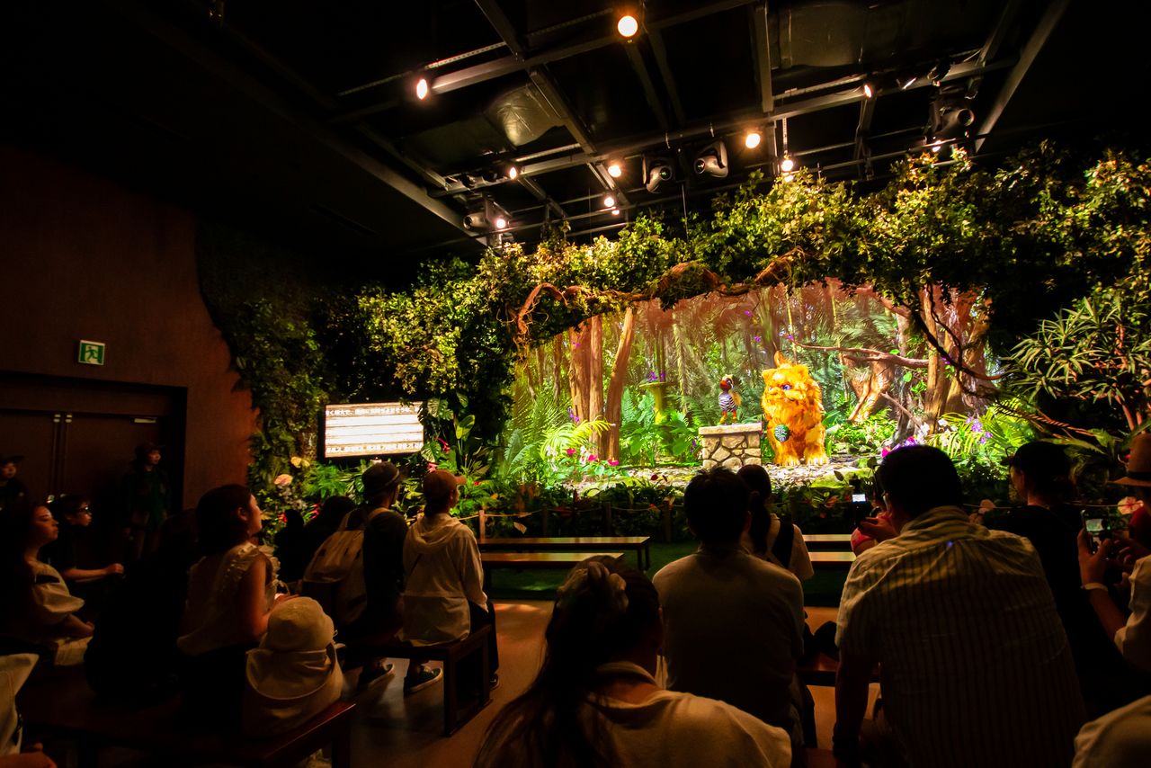 في منطقة (أصدقاء يانبارو)، ترشد شخصيات تميمة مستوحاة من طائر السكة الحديدية المحلي في أوكيناوا وإلهة الحماية (شيسا) الزوار أثناء استكشاف الغابة. (© Nippon.com)